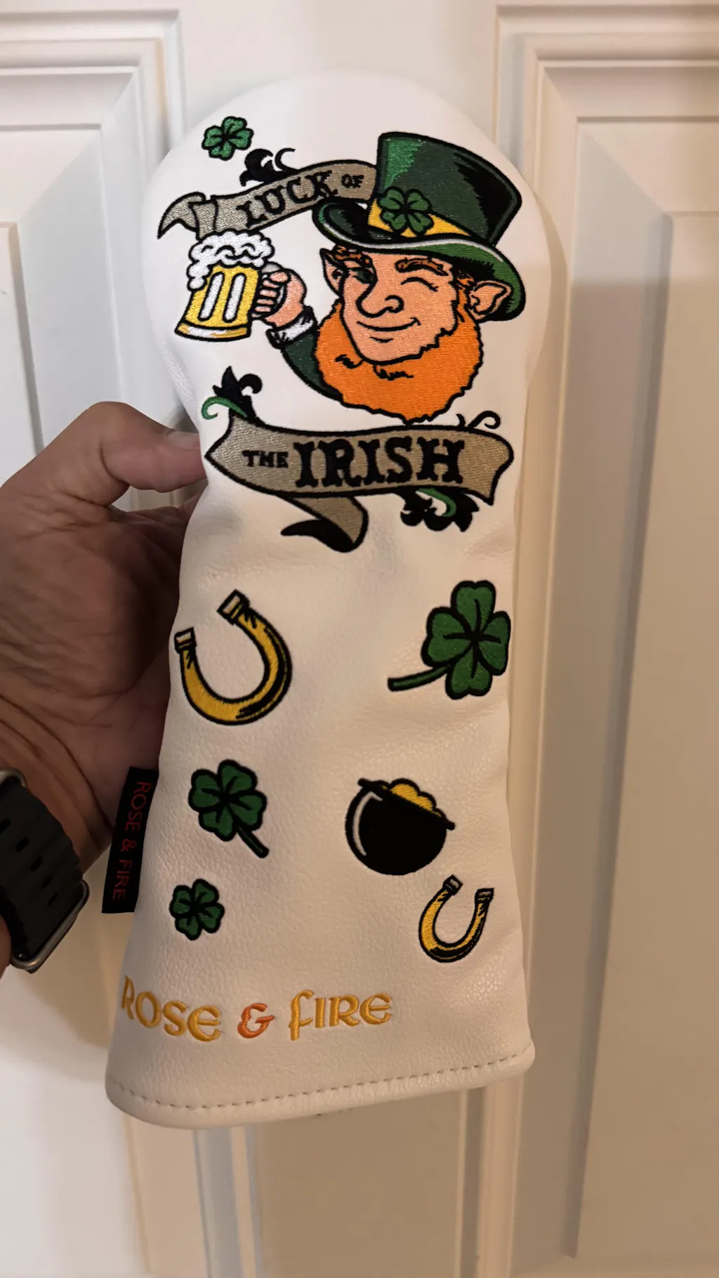 Caution, supplies are limited! Add a bold touch of luck to your bag with this Lucky Leprechaun headcover! Featuring a winking leprechaun raising a frothy pint and "Luck of the Irish" banners on our premium white cover. This design is packed with detail, including embroidered horseshoes, pots of gold, and shamrocks, all finished with golden "Rose & Fire" embroidery. Made in driver and fairway sizes only, these will not last long!